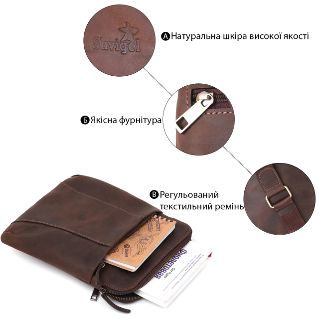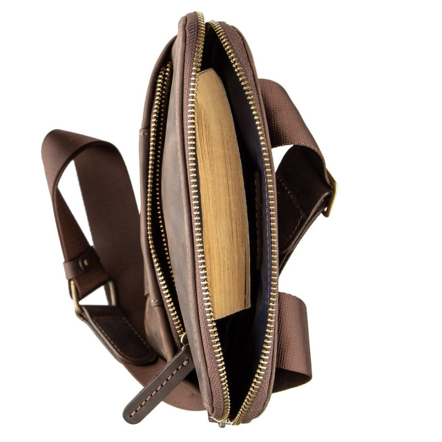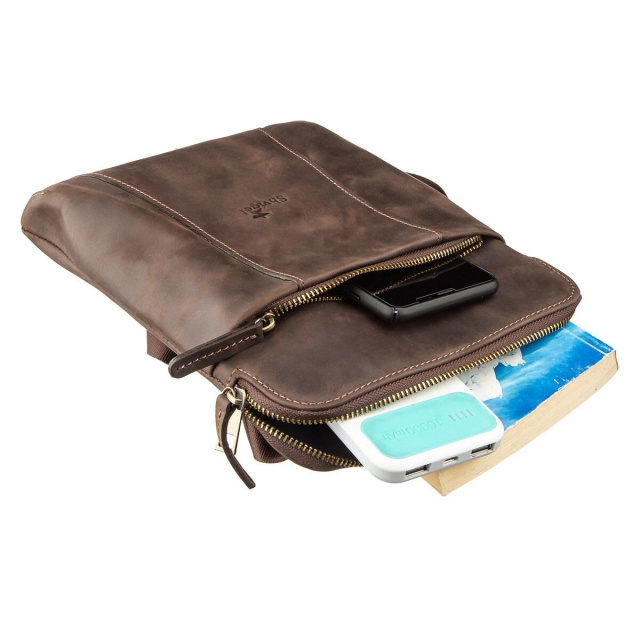 Модель сумки отлично подойдет для тех, кто ищет сумку компактного размера. Аксессуар прошит по краям коричневой строчкой. Выполнена из винтажной кожи, которая солидно и эффектно смотрится даже со временем эксплуатации. В комплекте сумки идет оранжевый тканевый чехол, что делает ее прекрасным вариантом для подарка.