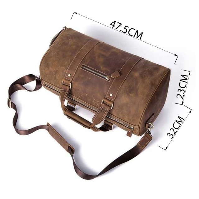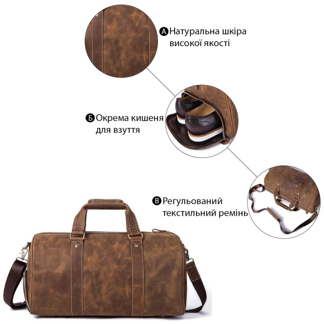 Солиднейшая мужская сумка из натуральной кожи. Идеальный помощник в любое путешествие. Внутри аксессуара плотная текстильная подкладка коричневого цвета. Аксессуар дополнен несъемным текстильным регулируемым ремешком. Очень современная и продуманная модель. Производство фабричный Китай хорошего качества. Сумка выполнена из гладкой кожи с учетом всех пожеланий потребителя и всех модных тенденций. Кожаные сумки зачастую носятся намного дольше, чем модели из заменителя или тканевые. Сумка не прихотлива в уходе и выглядит намного дороже, чем из ткани. Аксессуар дополнен качественной фурнитурой золотистого цвета из крепкого металла. Также вы можете поместить обувь в такую сумку. Будет прекрасным подарком по любому поводу.