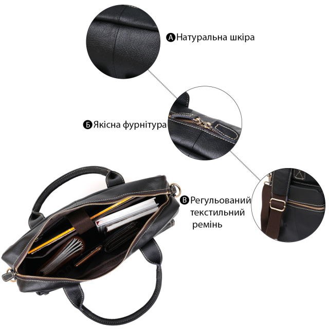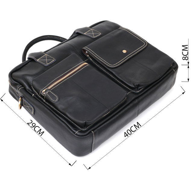 Удобная сумка для вашего ноутбука. Выполнена из 100% кожи. В сумке использована фурнитура золотистого цвета. Прошита светлой нитью. Вы можете носить сумку как в руках ( есть 2 ручки кожаные), так и на плече с помощью текстильного съемного ремешка. Производство – фабричный Китай высокого качества. Аксессуар приятный на ощупь и станет прекрасным дополнением к вашему образу. Вы можете приобрести такую сумку на подарок близкому человеку. Внутри сумки текстильная подкладка коричневого цвета и все молнии коричневого цвета в сумке. Модель упакована в чехол от пыли.