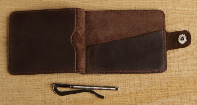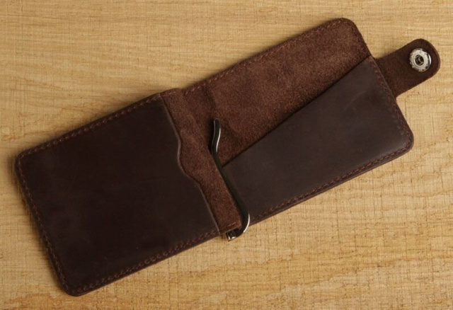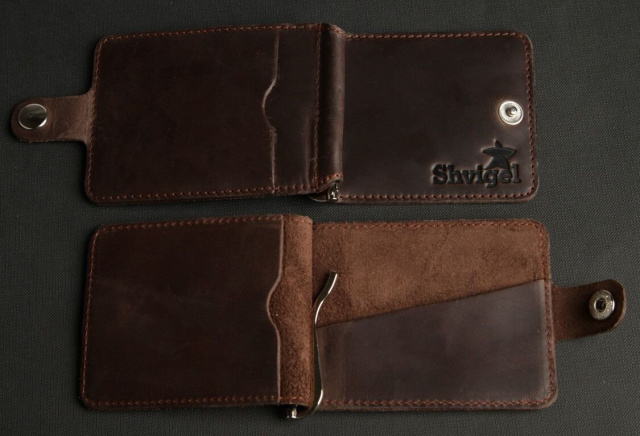 Шикарный зажим для банкнот коричневого цвета. Аксессуар выполнен из высококачественной винтажной кожи. Цвет фурнитуры: серебро. Изделие аккуратно прошито сверхпрочной нитью. Закрывается при помощи кожаного хлястика на кнопке. На задней внешней стороне аксессуара расположен карман для пластиковых карточек. Такой зажим для денег является отличным решением для подарка, так как упакован в красивый, фирменный текстильный чехол.