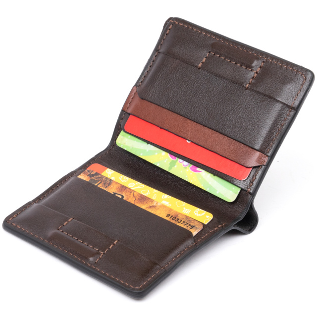 Маленький, но при этом очень стильный аксессуар. Портмоне с ячейками для карточек из натуральной итальянской кожи высочайшего качества. Аксессуар имеет оригинальный дизайн с вставками коричневого цвета на тон светлее, что добавляет модели новизны и креативности. Аксессуар станет находкой для тех, кто хочет выделиться из толпы и подчеркнуть свою индивидуальность. Портмоне имеет одно отделение для купюр. Советуем модель поклонникам аксессуаров с минимальным дизайном и тем, кто предпочитает не носить много налички. Изделие упаковано в войлочный чехол. Портмоне станет прекрасной идеей для подарка.