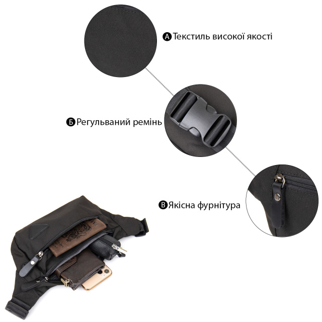 Компактная бананка из нейлона классического черного цвета. Аксессуар имеет небольшой размер и практичный функционал. Сумка очень легкая и удобная. С бананкой все ваши личные вещи будут под рукой и перед вашими глазами. Аксессуар дополнен качественной фурнитурой и плотной подкладкой. Бананка подойдет как для мужчин так и для женщин. С такой сумкой удобно также ходить на занятия спортом или путешествовать. На нашем сайте изделие доступно в разных цветах. Рекомендуем вам бананку в качестве удобной и бюджетной сумки.