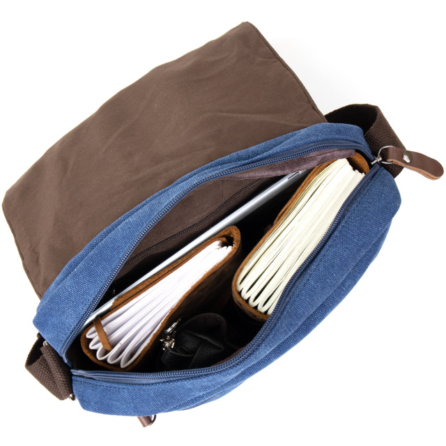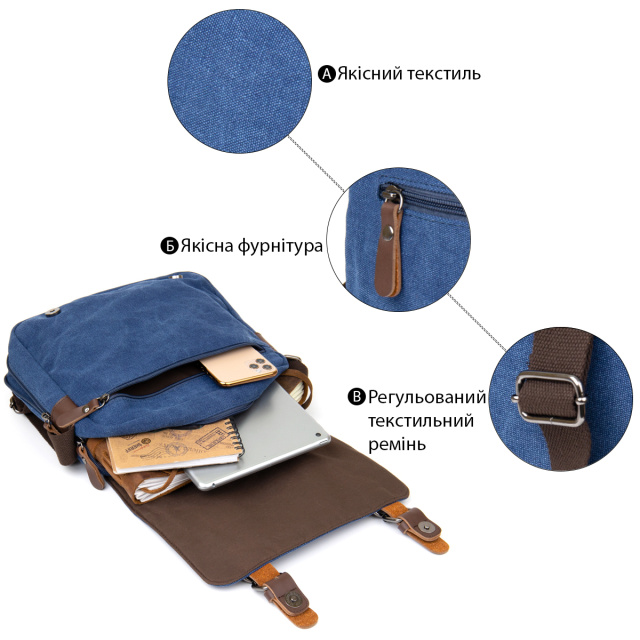 Небольшая сумка почтальонка в универсальном синем цвете. Аксессуар дополнен необходимым функционалом. Закрывается сумка на клапан с магнитными кнопками. Внутри - плотная текстильная подкладка. Сумку удобно носить на плече. Текстильный ремешок не снимется. Сумка идеальный вариант на каждый день по бюджетной стоимости.