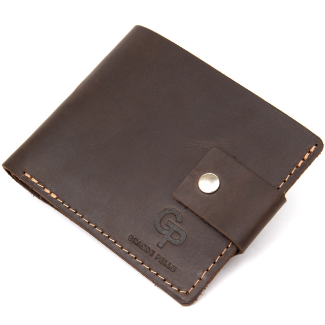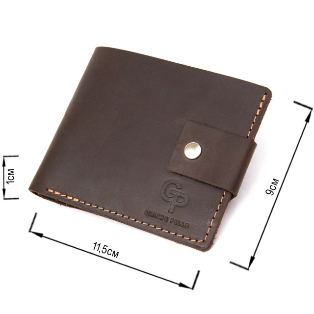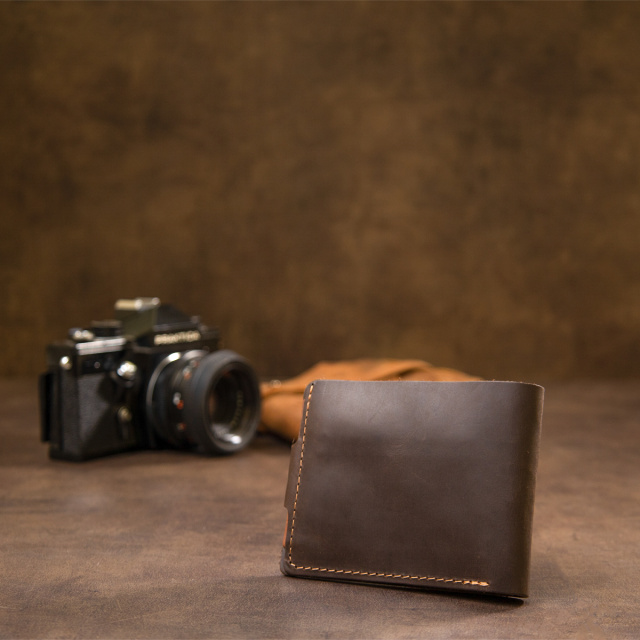 Компактное мужское портмоне из высококачественной винтажной кожи. Имеет красивый шоколадный цвет, внутри монетница и кармашек для карточек имеют более светлый оттенок. Это портмоне имеет довольно оригинальный вид, поэтому обязательно понравится неординарным личностям. Упаковано портмоне в фирменный чехол.