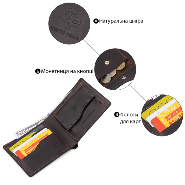 Красивое стильное мужское портмоне компактных размеров, поэтому легко поместится в сумке или кармане. Материал изготовления – износоустойчивая натуральная кожа в матовой гладкой фактуре. Внутри есть отделения для купюр, карманы для карточек и небольшая монетница на кнопке. Упаковано портмоне в фирменный плотный чехол.