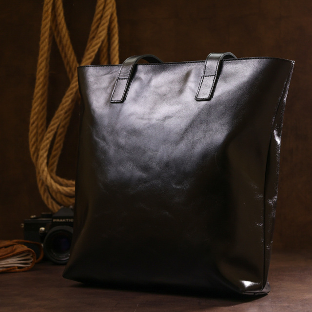 Вместительная сумка-шоппер стандартного размера в универсальном черном цвете, поэтому отлично впишется в гардероб любой модницы. Выполнена из натуральной высокопрочной кожи, качество которой видно даже на расстоянии. Имеет одно просторное отделение и потайной карман на молнии. Ручки сделаны также из плотной натуральной кожи. Фактура – гладкая и приятная на ощупь.