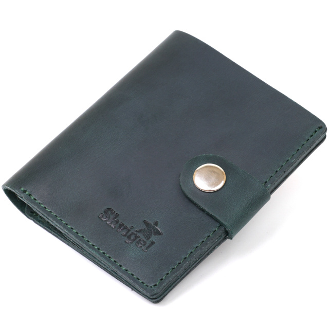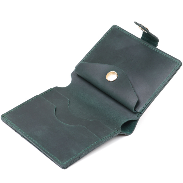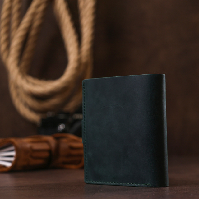 Прекрасное стильное портмоне в винтажном стиле и современном дизайне. Изготовлено изделие из натуральной кожи высокого класса, качество которой видно невооруженным глазом. Внутри есть вместительное основное отделение для купюр, слоты для пластиковых карточек и небольшая монетница на кнопке. Цвет изделия – темно-зеленый, фактура – матовая гладкая.