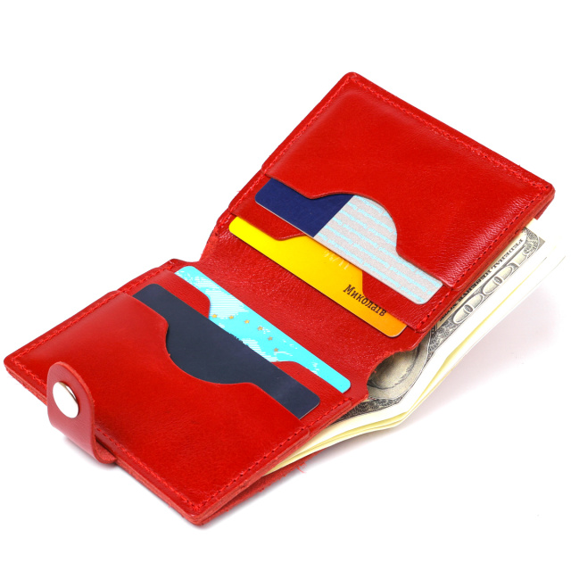Замечательное женское портмоне в красивом красном цвете и стильном дизайне. Имеет просторное основное отделение и слоты для пластиковых карточек. Выполнено изделие из натуральной кожи высокого качества и отличными характеристиками. Закрывается данная модель на хлястик с кнопкой, что очень удобно и практично.