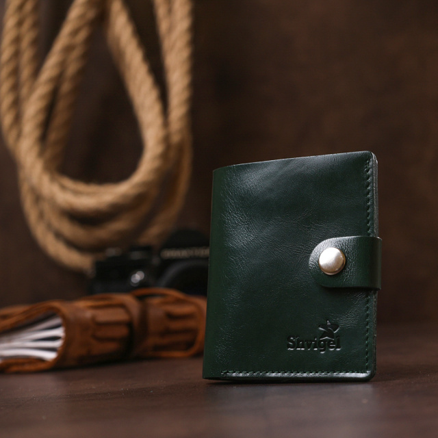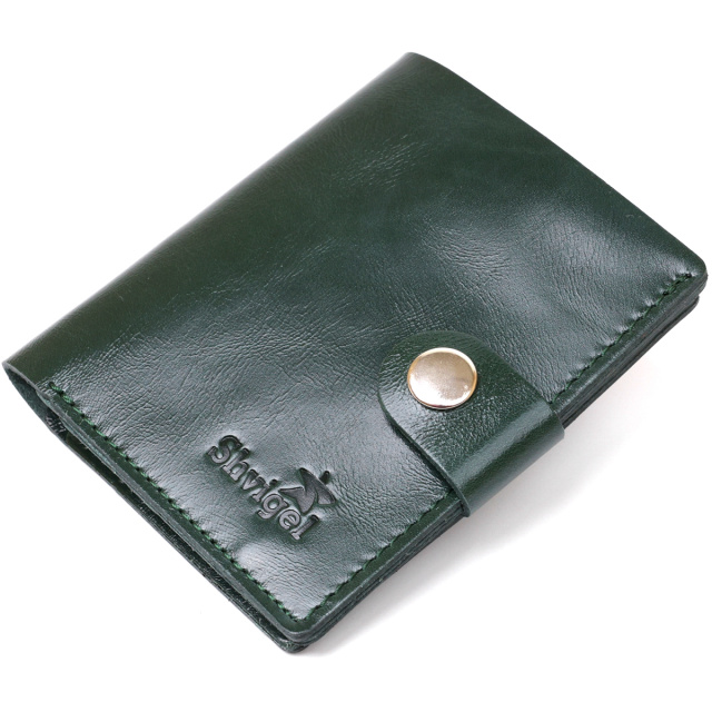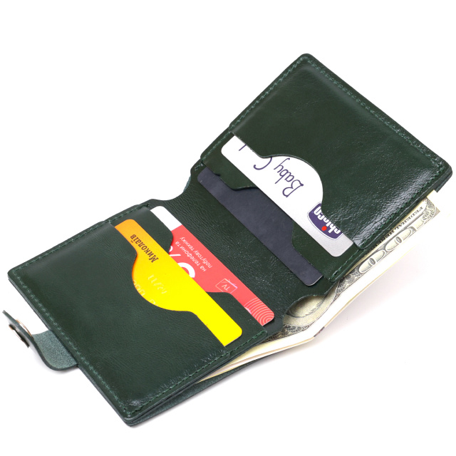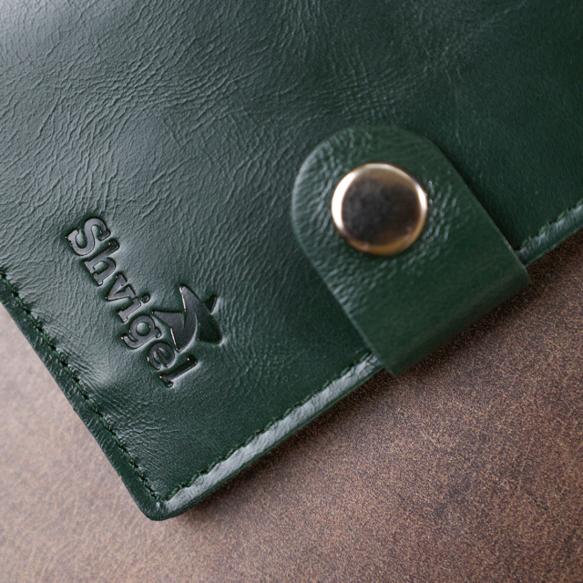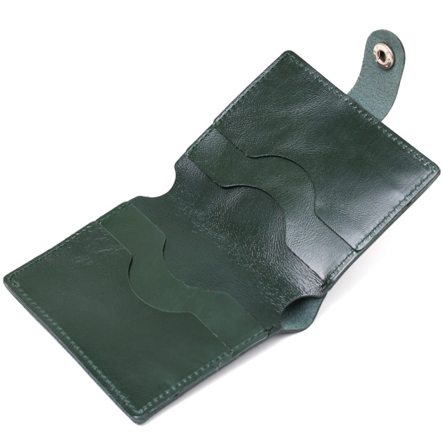 Стильное портмоне в два слоения для ценителей строгого и лаконичного дизайна. Изготовлено оно из натуральной кожи с улучшенными показателями прочности и износостойкости. Цвет изделия – темно-зеленый с отливом, фактура – гладкая и приятная на ощупь. Внутри есть отделение для купюр и несколько слотов для визитных и кредитных карточек.