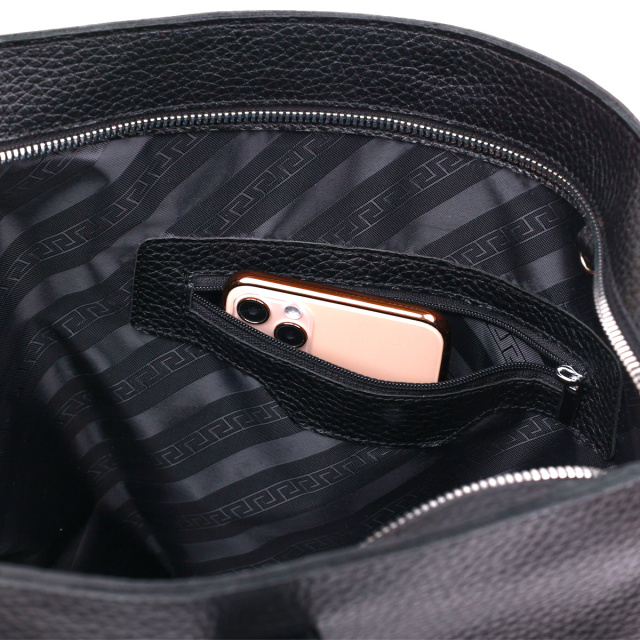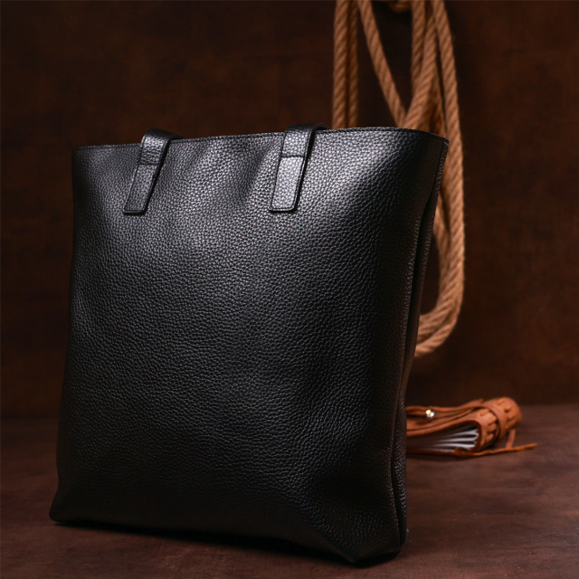 Универсальная женская сумка-шоппер от украинского производителя в практичном черном цвете, поэтому легко подойдет под любой цвет и стиль одежды. Выполнена модель из натуральной кожи высокого качества и отменными характеристиками. Фактура – зернистая и очень приятная на ощупь. Внутри есть одно вместительное отделение на молнии и потайной карман.