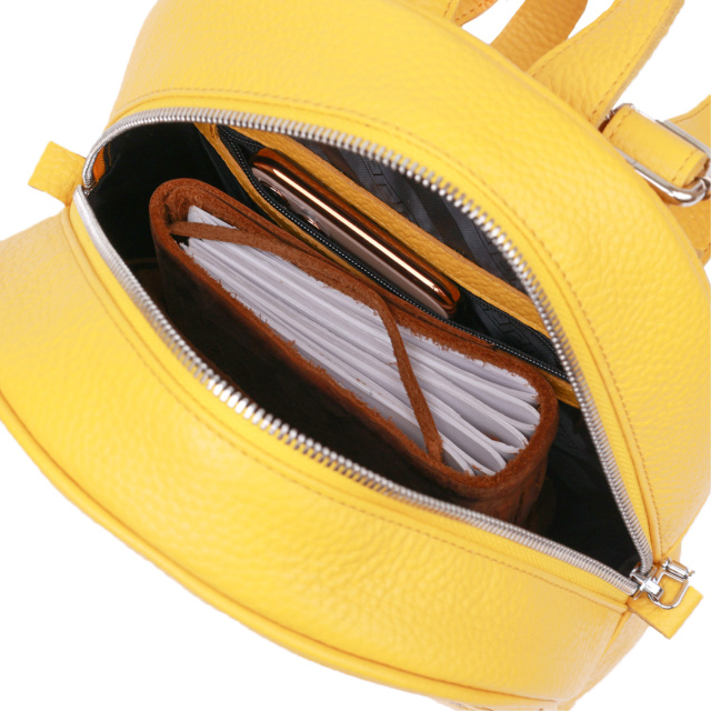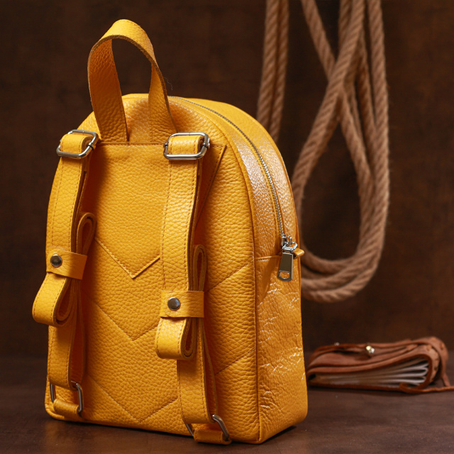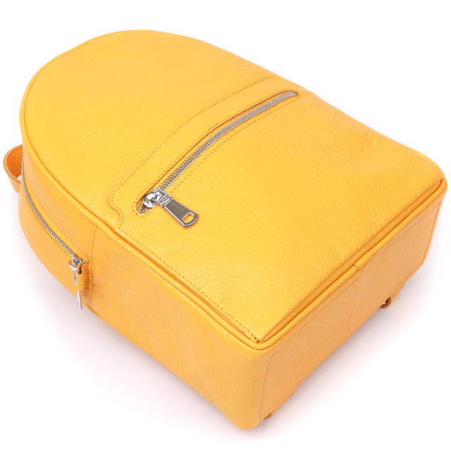 Практичный женский рюкзак небольшого размера в строгом привлекательном дизайне. Выполнено изделие из натуральной кожи высокого класса и повышенной стойкости к износу. Цвет данной модели  - сочный желтый, что смотрится очень красиво и по-летнему ярко. Внутреннее наполнение представлено в виде вместительного основного отделения и нескольких карманов.