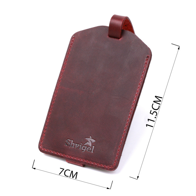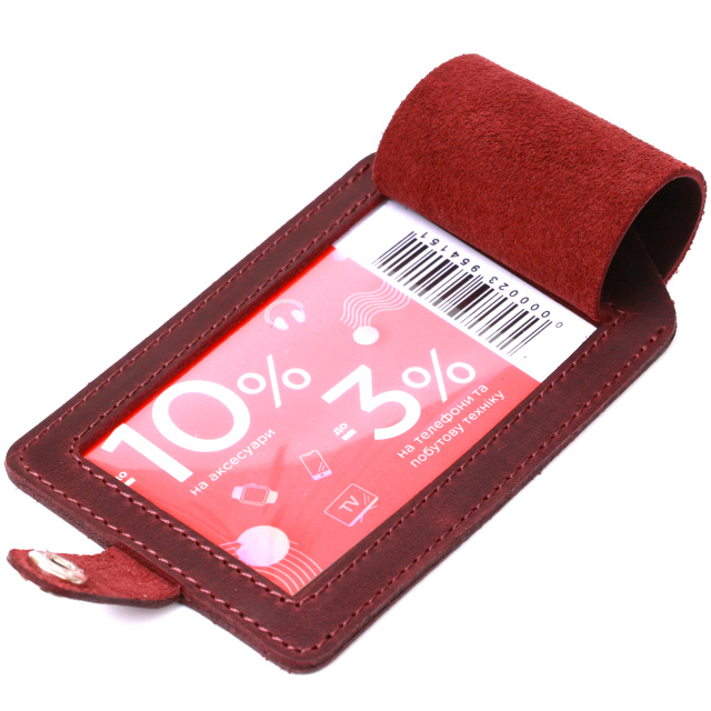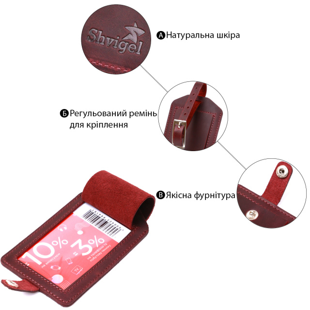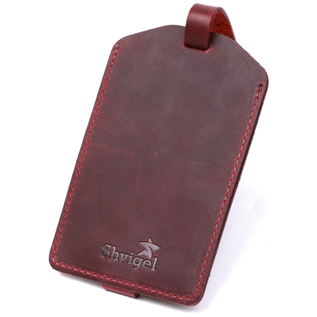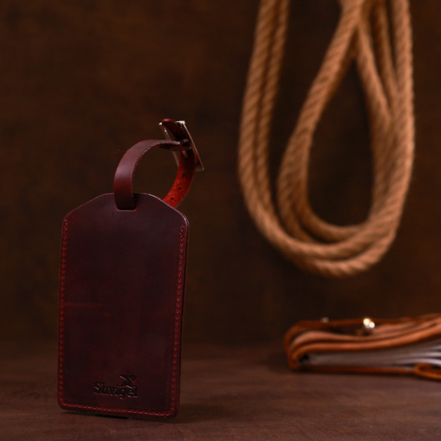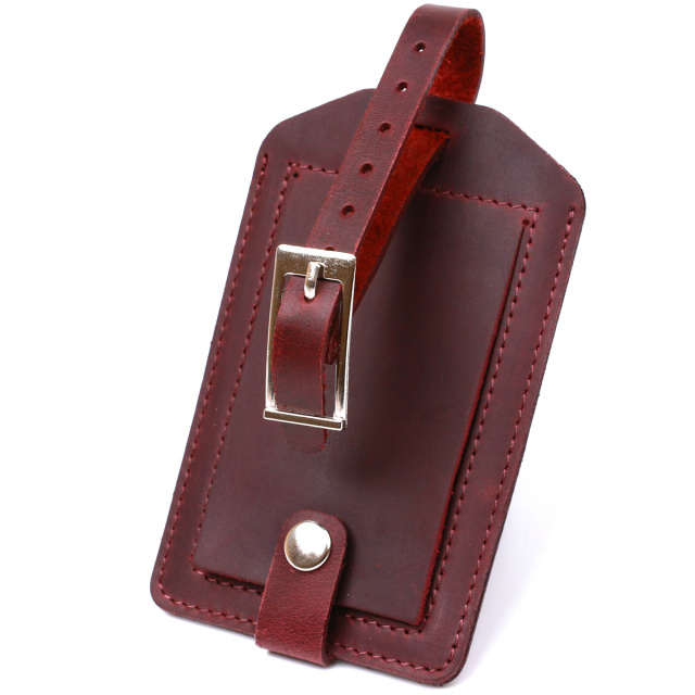 Добротная бирка на чемодан в практичном дизайне от украинского производителя. Материал изготовления – натуральная кожа высокого качества и сопротивляемости к износу. Цвет аксессуара – бордовый, фактура – матовая гладкая и очень приятная на ощупь. Крепится бирка с помощью регулируемого ремешка, информационный слот закрывается клапаном с кнопкой, что очень удобно и практично.