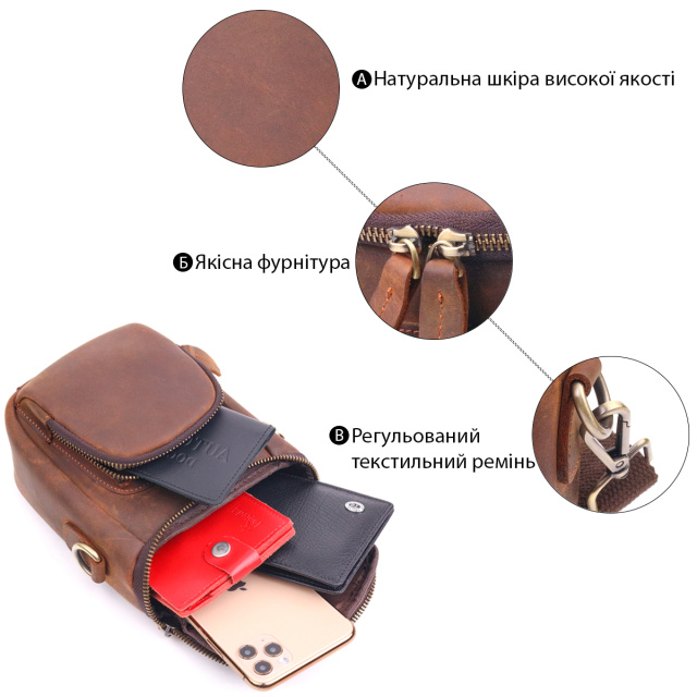 Мужская сумка не большого размера из натуральной винтажной кожи с отменными характеристиками качества и износостойкости. Аксессуар имеет не большое но вместительное основное отделение и два дополнительных кармашка для мелочей. Съемный плечевой ремень можно регулировать по длине, выполнен он из крепкого текстиля. Цвет фурнитуры желтый. Кожаная сумка, всегда была отличным подарком для родных и близких людей.