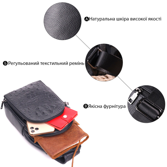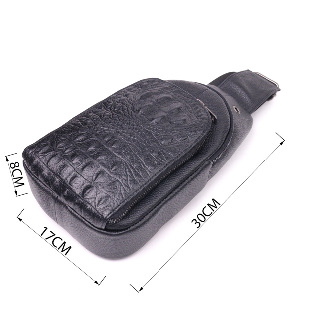 Привлекательная мужская сумка слинг через плечо из натуральной высококачественной кожи с отменными характеристиками качества и износостойкости. Аксессуар имеет довольно вместительное основное отделение и дополнительные карманы на внешней и тыльной стороне для вещей, которые должны быть быстро доступны. Акцент сумки, в виде тиснения под крокодила, придает ей стильного и интересного вида. Ремень можно регулировать по длине, выполнен он из высокопрочного текстиля. Кожаная сумка, всегда была отличным подарком для родных и близких людей.