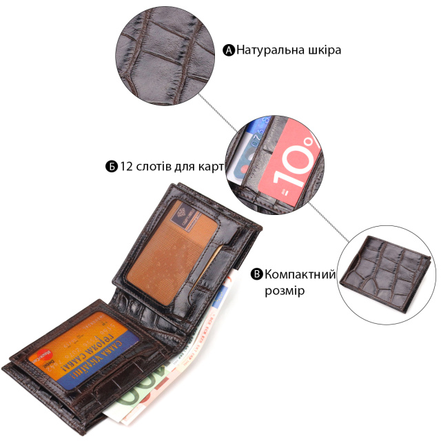 Миниатюрный мужской бумажник, из натуральной фактурной кожи, с тиснением под крокодила. Аксессуар имеет одно основное отделение с перегородкой, в которое помещаются купюры всех номиналов, двенадцать карманов для карточек, четыре из которых под сеточкой. Вы легко сможете поместить его в карман брюк или маленькую сумку. Упакован бумажник картонную коробку. Кожаный кошелек является отменным подарком для родных и близких людей.