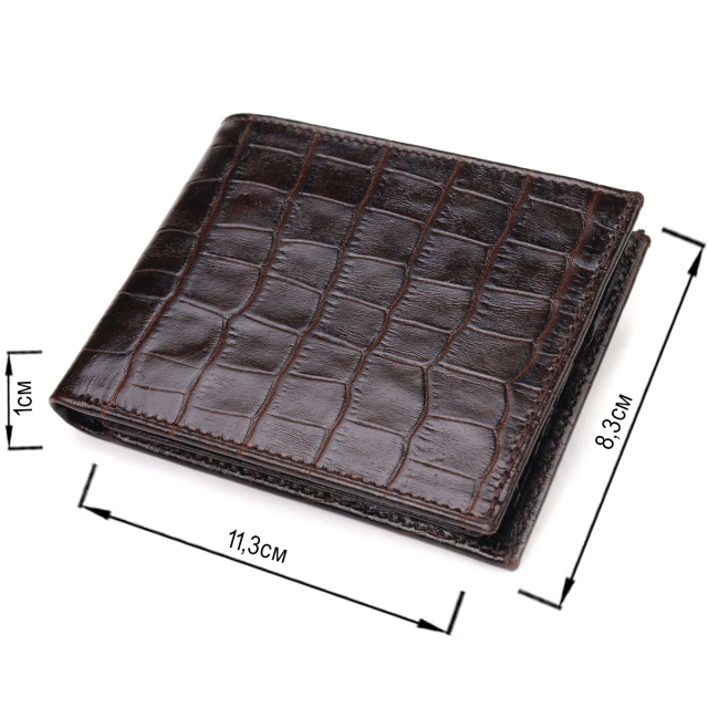 Компактный мужской бумажник, из натуральной фактурной кожи, с тиснением под крокодила. Аксессуар имеет одно основное отделение с перегородкой, в которое помещаются купюры всех номиналов, двенадцать карманов для карточек, четыре из которых под сеточкой. Вы легко сможете поместить его в карман брюк или маленькую сумку. Упакован бумажник картонную коробку. Кожаный кошелек является отменным подарком для родных и близких людей.