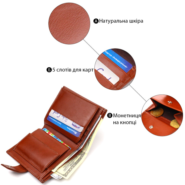 Интересный компактный мужской кошелек из натуральной гладкой кожи. Аксессуар имеет основное отделения с перегородкой, пять отсеков для карточек, два прилегающих кармана, прозрачный карман для документов и монетницу. Закрывается аксессуар хлястиком на кнопку. Отличный аксессуар от надежного производителя, который прослужит очень долго.