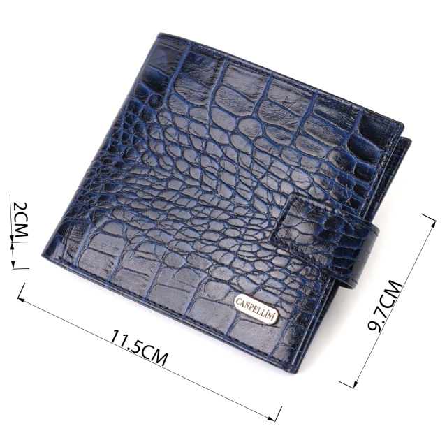 Стильный мужской бумажник из натуральной фактурной кожи с тиснением под крокодила. Аксессуар имеет основное отделение для купюр, три ячейки для карточек, два кармана под сеточкой, карман на молнии через всю длину и монетницу, что закрывается клапаном на кнопку. Кошелек складывается пополам и закрывается хлястиком на кнопку. На лицевой стороне в правом нижнем углу, расположен металлический логотип компании производителя. Многофункциональный мужской бумажник из очень прочной кожи отличный выбор подарка для солидного мужчины.