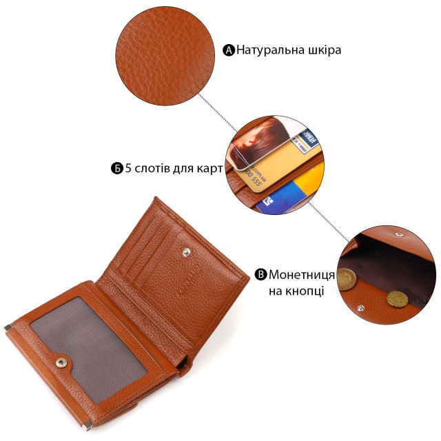 Женский кошелек среднего размера из натуральной кожи флотар, которая имеет зернистую фактуру. Аксессуар имеет одно основное отделение с тканевой перегородкой в которое помещаются купюры всех номиналов, пять карманов для карточек (один под сеточкой), два скрытых кармана и монетницу. Закрывается аксессуар в два сложения на кнопку. Приобретая кожаный аксессуар этой фирмы, себе или на подарок, будьте уверены, что он прослужит Вам не один год.