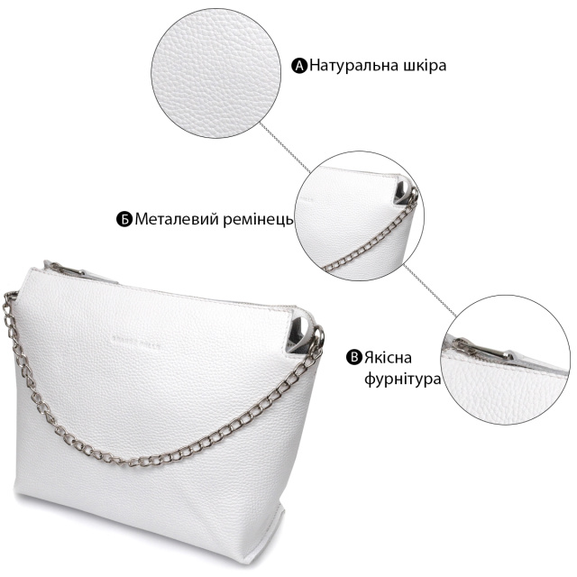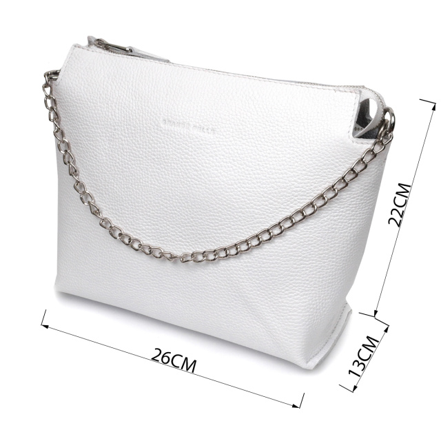 Отличная женская сумка из натуральной качественной кожи. Аксессуар состоит из основного отделения, что закрывается на молнию и кармана открытого типа внутри. Выполнена из прочной и износостойкой натуральной кожи. Носить данную сумку можно на плече при помощи регулируемого текстильного ремня, а также в руках при помощи съемного ремня-цепочки. Упакована данная сумка в красивый фирменный чехол с ручками.
