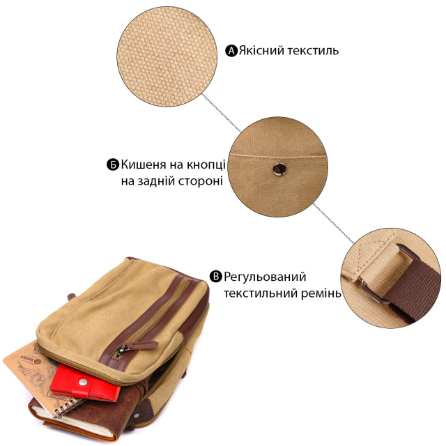 UA MarketКиївJANAВсе товарыТовари та послугиСумки мужскиеМужские сумкиКожаные мужские сумкиИнтересная мужская сумка через плечо из плотного текстиля Vintage 22194 Песочный