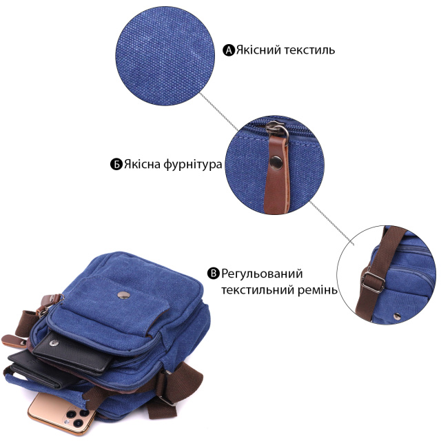 UA MarketКиївJANAВсе товарыТовари та послугиСумки мужскиеМужские сумкиКожаные мужские сумкиУдобная небольшая мужская сумка из плотного текстиля Vintage 22221 Синий
