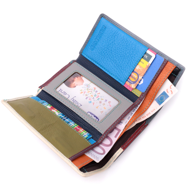 Оригинальное женское портмоне в три сложения удобного среднего размера из натуральной кожи высочайшего качества. Первое, что бросается в глаза это цветовое решение, вместо однотонного аксессуара мы имеем разноцветный, который содержит два основных наружных цвета и несколько дополнительных внутри. Кожаное портмоне очень практичное и служит достаточно долго. Аксессуар состоит из двух вместительных карманов для купюр, кармана на молнии через всю длину, пяти ячеек для карт, прозрачного окошка для пропуска и наружного кармана на молнии с перегородкой, что отлично прослужит для монет. Портмоне дополнено надежной фурнитурой. Укомплектован кошелек в фирменную картонную коробку белого цвета. Изделие станет идеальным подарком для девушки любого возраста.