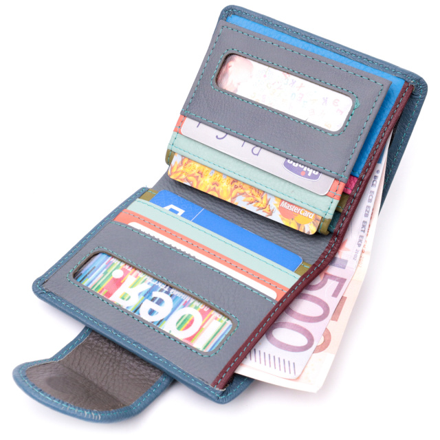 Качественное вертикальное портмоне в два сложения удобного размера из натуральной кожи высочайшего качества. Кошелек серо-бирюзового цвета снаружи и разноцветный внутри, что очень стильно и современно. Кожаное портмоне очень практичное и служит достаточно долго. Аксессуар состоит из основного отделения с кожаной перегородкой для купюр, кармана на молнии через всю длину, монетницы, девяти ячеек для карт, прозрачного окошка для пропуска и трех скрытых карманов. Портмоне дополнено надежной фурнитурой и прошито по краю ровной строчкой бирюзового цвета. Укомплектован кошелек в фирменную картонную коробку белого цвета. Изделие станет идеальным подарком для девушки любого возраста.