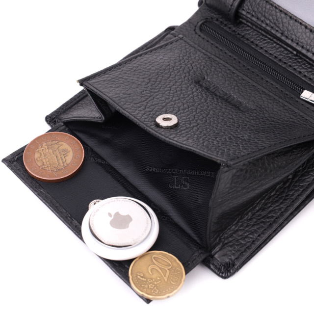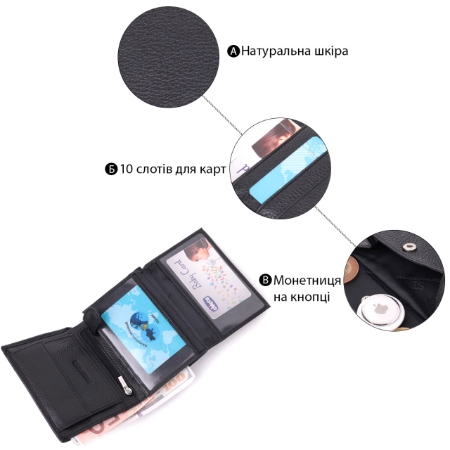 - 1 карман для монет, что закрывается клапаном на кнопку;