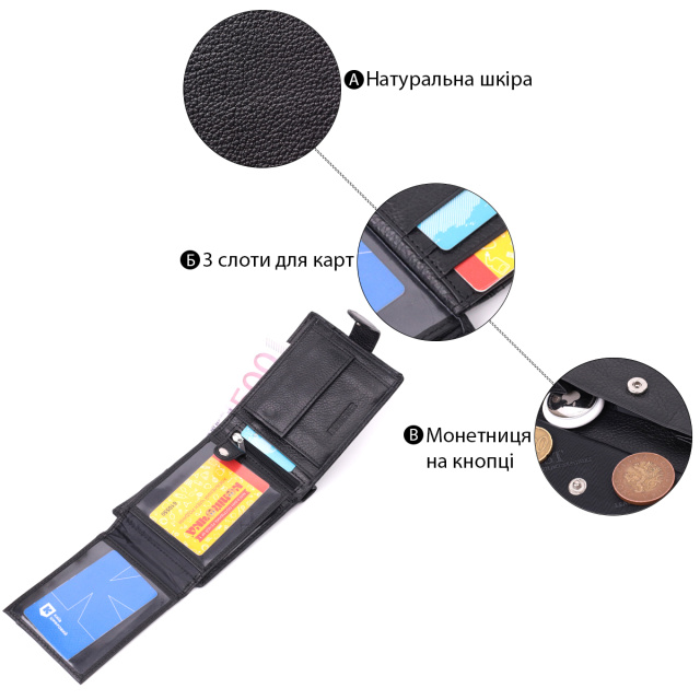 - 1 карман для монет на кнопке под клапаном;