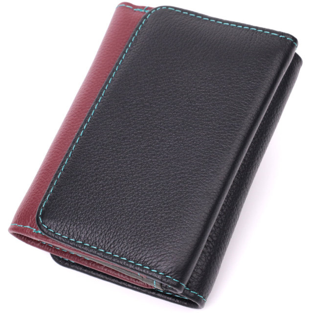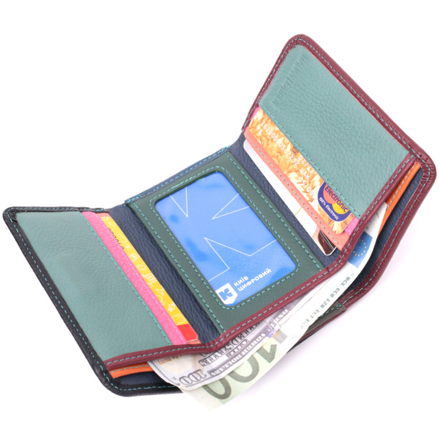 Качественный женский кошелек среднего размера из натуральной кожи. Отличительная особенность этого кошелька двухцветная наружная часть и многоцветная внутренняя часть. Данная модель тройного сложения, которая закрывается на клапан с магнитом. Внутри есть два отделения для купюр, монетница, пять слотов под пластиковые карты, одно окошко для фото, а также два скрытых отделения. Отменный функционал и удобный размер создает идеальную модель кошелька для повседневного использования.
