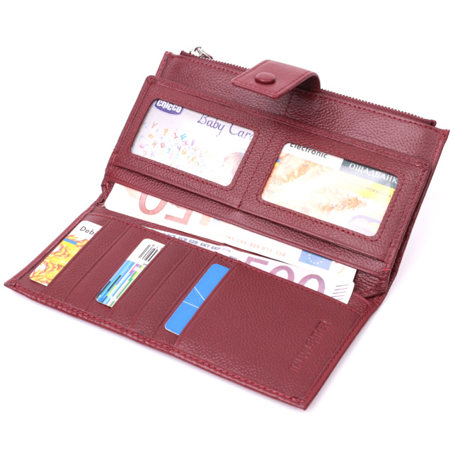 Вертикальный женский кошелек из натуральной добротной кожи. Особенностью модели есть то, что ее можно носить на кисти, для этого предусмотрен съемный кожаный кистевой ремень. Аксессуар состоит из четырех отделений для купюр, семнадцати ячеек для пластиковых карт, двух карманов под пленкой и монетницы. С таким кошельком Вы проходите далеко не один год. Модель упакована в коробочку, что очень удобно если изделие предназначено для подарка.