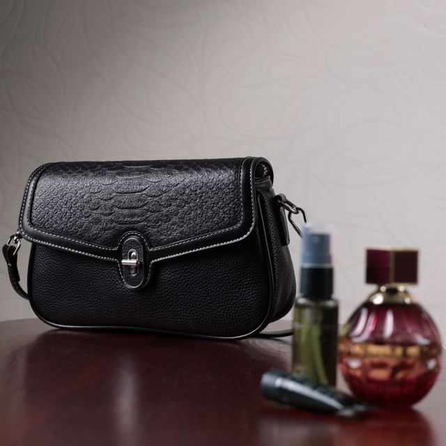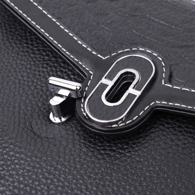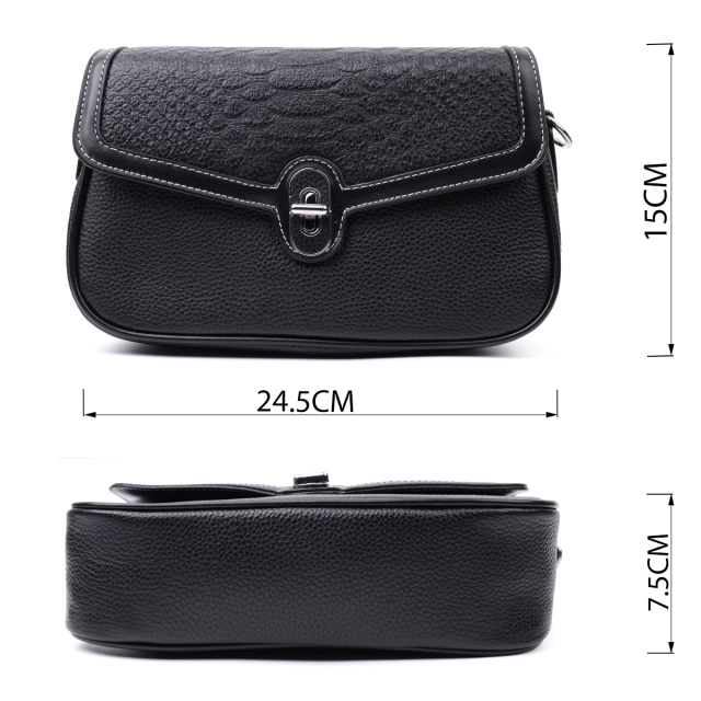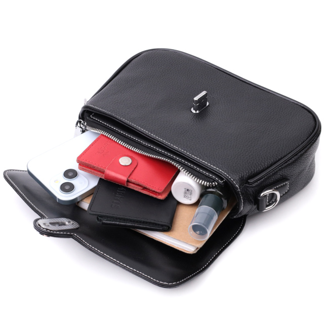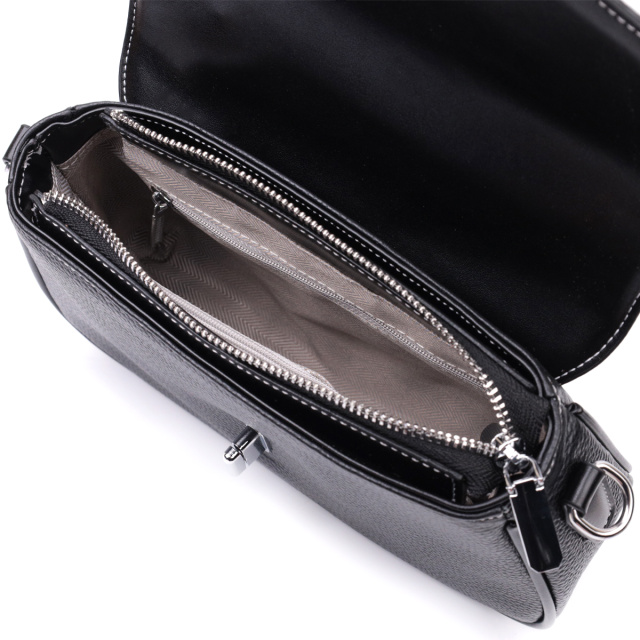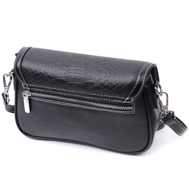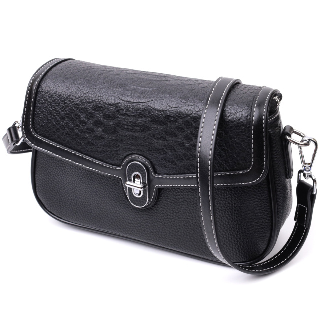 Удобная каркасная женская сумка из натуральной кожи. В изделии использована кожа черного цвета с белой строчкой по краю клапана. Притягивает взгляд в изделии фактурный клапан с тиснением под змею и изящная механическая защелка. Аксессуар состоит из основного отделения, кармана-перегородки на молнии, потайного кармана на молнии и кармана открытого типа, а также еще одного кармана снаружи, на тыльной стороне. Носить сумку можно в руке, под рукой, на плече и через плечо, для этого имеется кожаный съемный ремень. В аксессуаре использована качественная фурнитура цвета серебра. Универсальный вариант сумки на вечер, на каждий день, а также отлично будет сочетаться с деловым стилем.