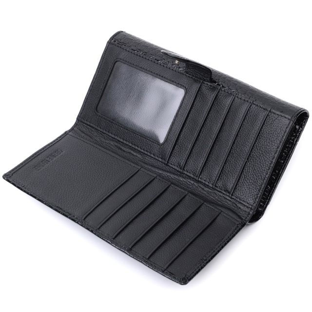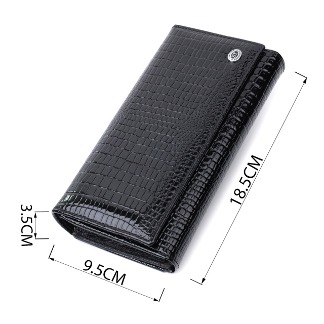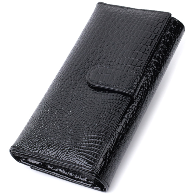 Стильный кошелек для женщин из высококачественной лакированной кожи с тиснением под рептилию. Имеет все необходимое, чтобы стать Вам незаменимым аксессуаром в повседневной рутинной жизни. Вы с легкостью поместите в него бумажные купюры, монеты, документы. Фишкой этого кошелька есть блок для карт, особенностью которого является наличие двух кнопок, что позволяет регулировать наполняемость блока. На лицевой стороне, в правом нижнем углу расположен металлический логотип производителя, что является залогом качества изделия. Упакован аксессуар в белую плотную картонную коробку с фирменным логотипом. Если же Вы решите такой аксессуар подарить близкому человеку, то Вам гарантированно будут очень благодарны.