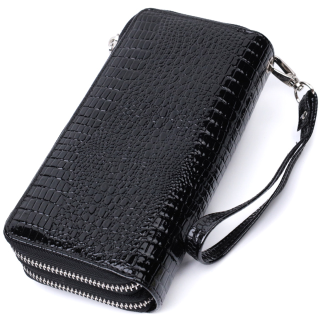 Удобный женский клатч в классическом стиле из натуральной лакированной кожи с тиснением под рептилию.  Для максимальной удобности кошелек разделен на два больших отделения, что закрываются на молнии. Аксессуар имеет все необходимое, чтобы стать Вам незаменимым помощником в повседневной жизни. Вы с легкостью поместите в него бумажные купюры, монеты, документы, карточки и даже смартфон. На лицевой стороне, вверху посередине расположен металлический логотип производителя, что является залогом качества изделия. Упакован аксессуар в белую плотную картонную коробку с фирменным логотипом.
