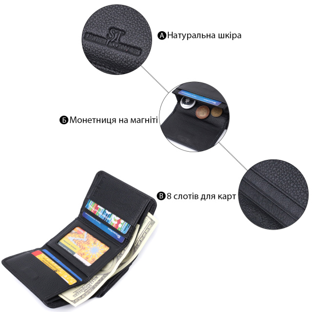 Стильный женский кошелек из натуральной качественной кожи. Модель имеет удобный размер и закрывается на магнит. Снаружи можно увидеть отделение для монет, которое закрывается клапаном на магнит. Аксессуар внутри оснащен двумя отделениями для купюр и восемью ячейками для карт. Упакован аксессуар в белую плотную картонную коробку с фирменным логотипом.