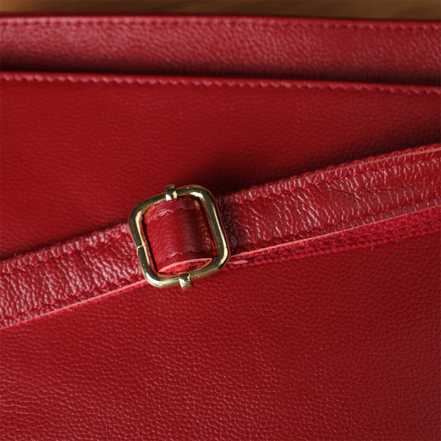 Фурнитура выполнена в цвете жёлтого золота, что выгодно контрастирует с ярким красным цветом кожи и придаёт модели изысканный и благородный вид.