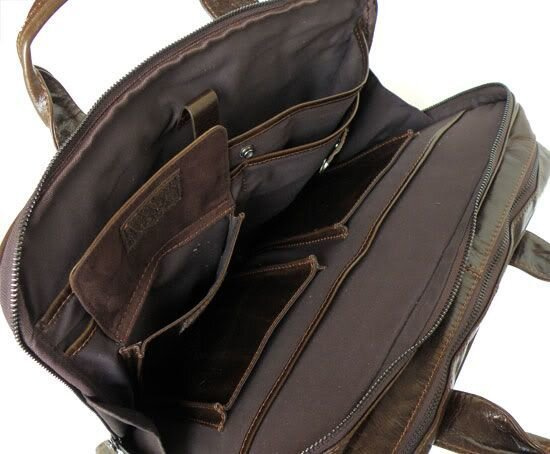 На передней панели расположен карман на молнии, внутри которого предусмотрены отделения для кредитных карт. На задней панели находится еще один карман на молнии для вещей, которые должны быть под рукой. Сумка имеет два основных автономных отделения на молниях, что позволяет удобно распределить документы, технику и личные вещи.