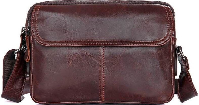 Отличная мужская сумка коричневого цвета. Аксессуар выполнен из натуральной высококачественной кожи, которая отличается легким, едва заметным блеском. Цвет фурнитуры: темное серебро. На лицевой стороне расположен небольшой карман под клапаном на магнитах. На задней внешней стороне находится вместительное отделение на молнии. Сумка имеет три автономных отделения, которые закрываются на молнии, внутри одного из них находятся два кармана (один из них на молнии). Подкладка выполнена из прочного текстильного материала коричневого цвета.