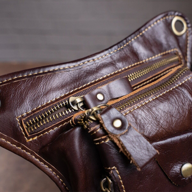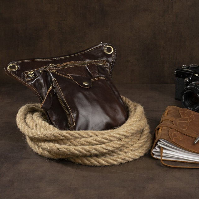 Сумка на пояс с оригинальным дизайном. Поясные сумки пользуются огромной популярностью среди мужчин. Очень удобно иметь такую сумку. Она очень универсальная и удобная в носке. Все самое важное будет у вас всегда под рукой. А украсть сумку с пояса будет намного сложнее. Поэтому с такой сумкой вы бедете чувствовать себя безопаснее. Также, с ней удобно ездить в транспорте или брать ее на дальние поездки. Хороший вариант – малогабаритный, но при этом достаточно вместительный. Вам будет легко с такой сумки достать документы или деньги при необходимости. Модель прошита светлой строчкой и дополнена фурнитурой золотистого цвета. Будет хорошо смотреться в качестве подарка для близкого человека.