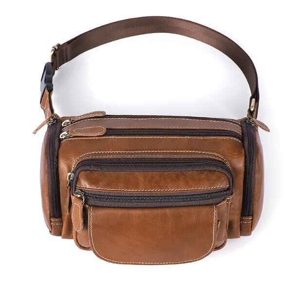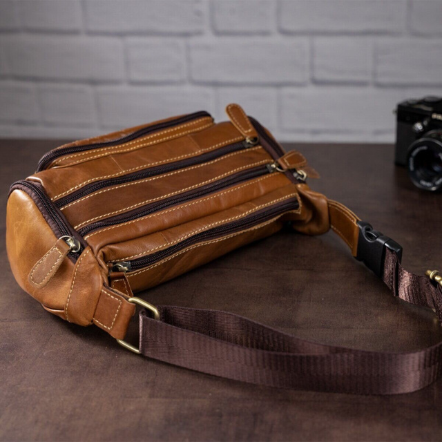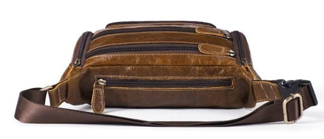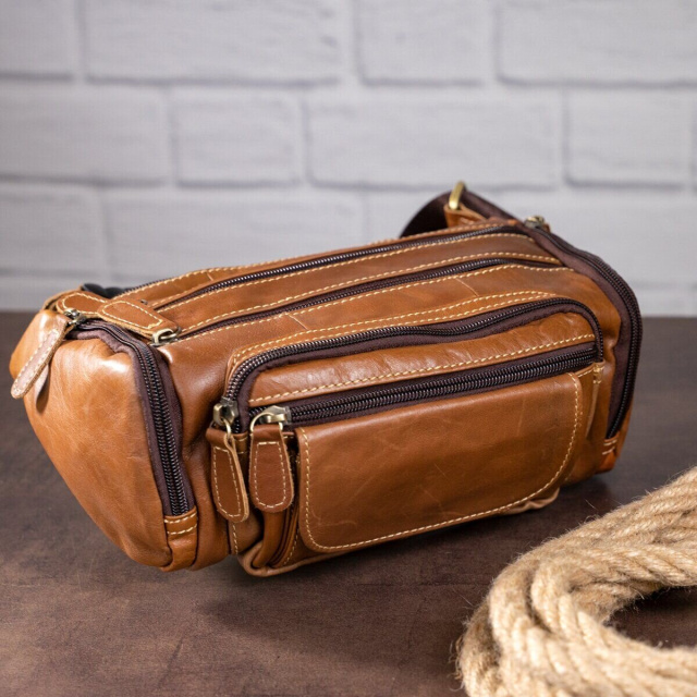 Объемная и вместительная бананка. Подойдет как для мужчин, так и для женщин. Идеальный вариант, для тех кто носит с собой много всякой мелочи. Аксессуар дополнен фурнитурой золотистого цвета. Прошит светлой нитью по краям. С такой сумкой все самое важное будет у вас всегда под рукой. А украсть сумку с пояса будет намного сложнее. Поэтому с такой бананкой вы будете чувствовать себя безопаснее. Также, с ней удобно ездить в транспорте или брать ее на дальние поездки. Вам будет легко с такой сумки достать документы или деньги при необходимости. Модель прошита рыжей строчкой и дополнена фурнитурой серебристого цвета. Будет хорошо смотреться в качестве подарка для близкого человека.
