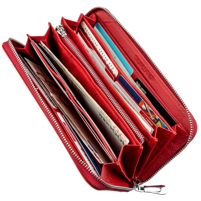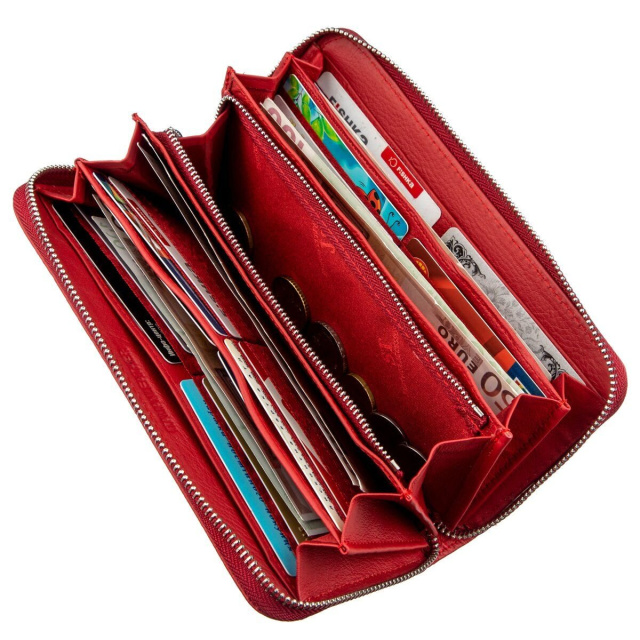 Грациозный женский кошелек-клатч из натуральной кожи, которая имеет мягкую, приятную на ощупь зернистую фактуру. Ваш глаз обязательно порадует непосредственный матовый красный цвет кошелька, который придает ему особый шарм. С таким клатчем любая женщина будет выглядеть красиво и необыкновенно. Отличительной чертой данного аксессуара является его многофункциональность, которая выражена большим количеством различных отделений и множеством карманов для пластиковых карт и визиток. На тыльной стороне изделия предусмотрено отделение на молнии для монет или других ценных мелочей. Если Вы ищите подарок для любимой женщины, то данный клатч просто находка для Вас. Он красивый, стильный и изящный! Упаковано данное изделие в плотную картонную коробку белого цвета.