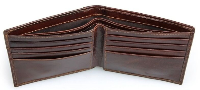 Тонкий мужской бумажник коричневого цвета. Аксессуар изготовлен из высококачественной натуральной кожи. Прошит кошелек прочной нитью светло-коричневого цвета. На лицевой стороне изделия находится накладной карман, в котором Вы найдете 3 отделения для пластиковых карточек. Отделение для монет в этом аксессуаре отсутствует. Кошелек упакован в текстильный пылезащитный чехол.