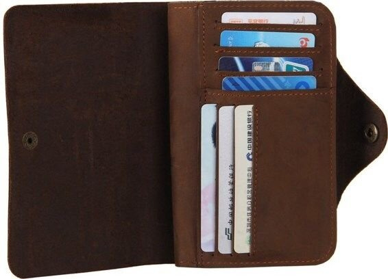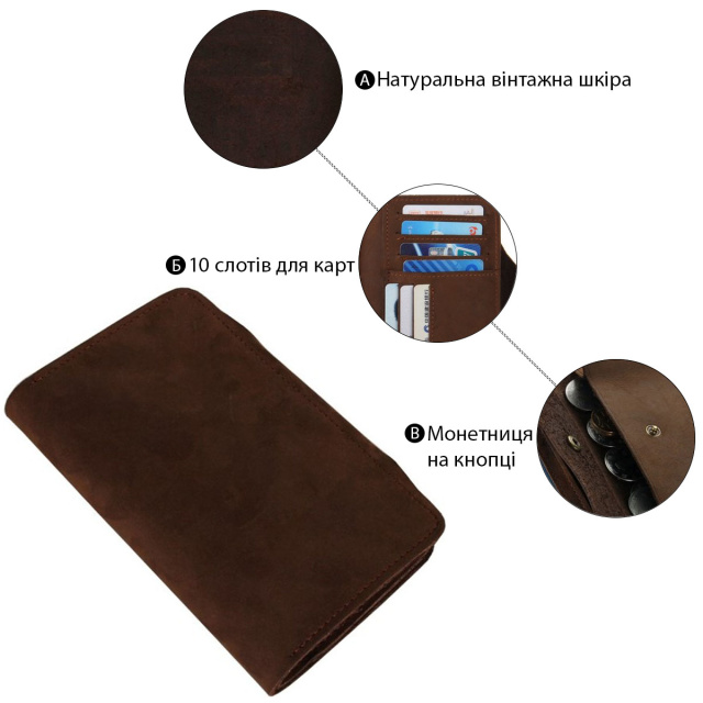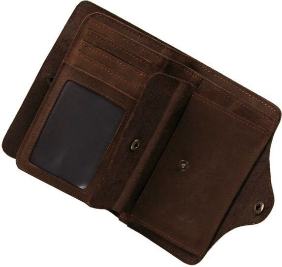 Вместительный мужской кошелек из добротной винтажной кожи, для которой характерны неоднородность окраса и потертости, которые придают изделию изысканного вида. Своим дизайном он подчеркивает стиль и вкус обладателя данного кошелька. Аксессуар закрывается на кнопку, прошит прочной коричневой нитью, упакован в текстильный пылезащитный чехол белого цвета.