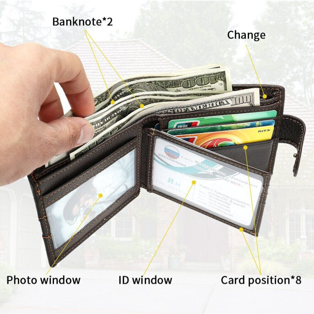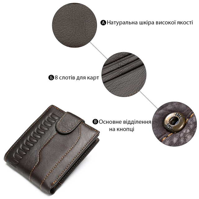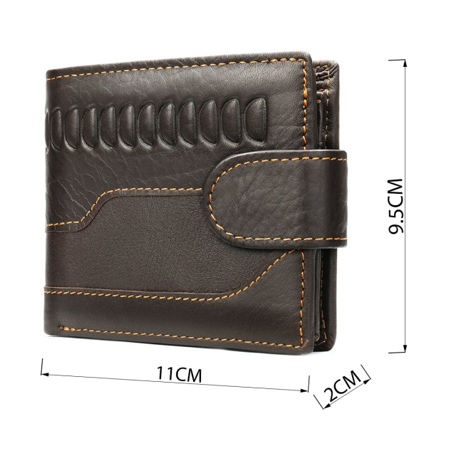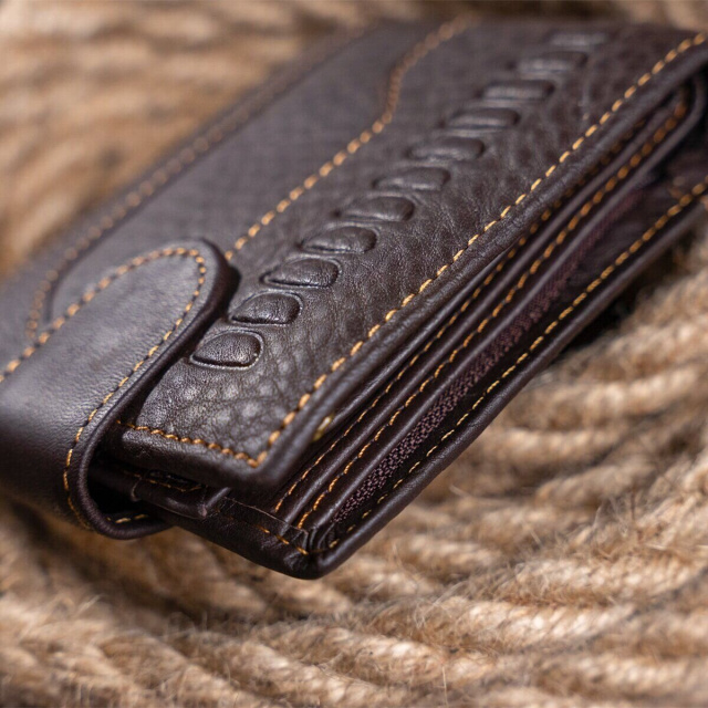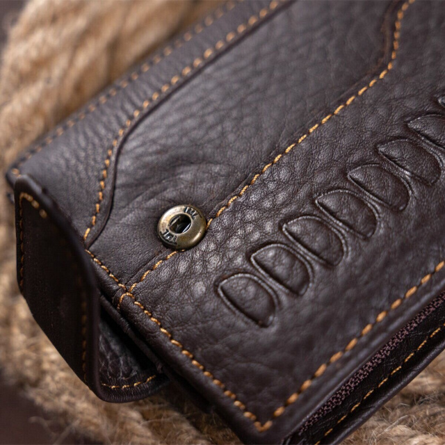 Функциональный и стильный кошелек для мужчин с тиснением. Аксессуар из натуральной кожи. Компактный кошелек легко поместится в вашу сумку или карман. По краям модель прошита светлой нитью. Изделие закрывается на кожаный хлястик с кнопкой. Кошелек прекрасно подойдет на подарок для мужчин.