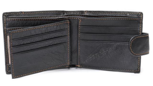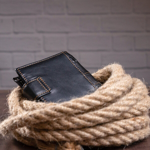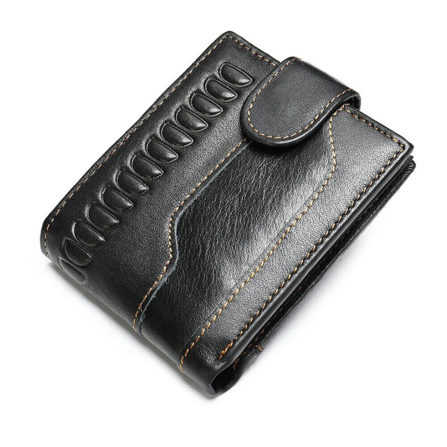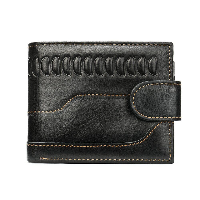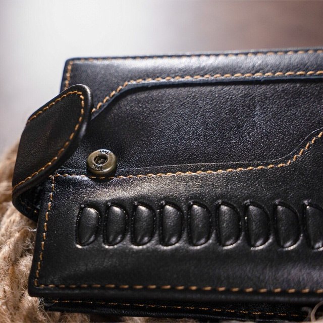 Функциональный и стильный кошелек для мужчин с тиснением. Аксессуар из натуральной кожи. Компактный кошелек легко поместится в вашу сумку или карман. По краям модель прошита светлой нитью. Изделие закрывается на кожаный хлястик с кнопкой. Кошелек прекрасно подойдет на подарок для мужчин.