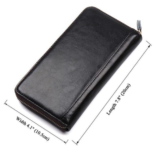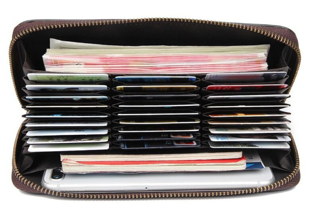 Очень вместительная кожаная визитница, которая закрывается молнией. Кроме визиток в данный аксессуар может с легкостью поместиться мобильный телефон, а также множество кюпур. Визитницу очень удобно держать в одной руке.
