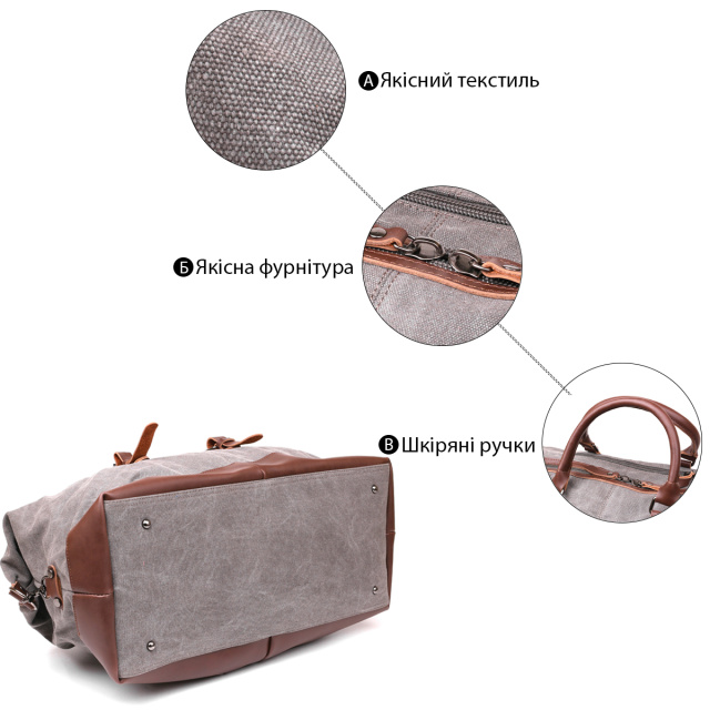 Изделие выполнено из качественного текстиля серого цвета. Материал легко стирается, неприхотлив в уходе и хорошо подходит для активного использования. Большой формат делает сумку удобной для вещей в дорогу, спортивной формы и других необходимых принадлежностей.