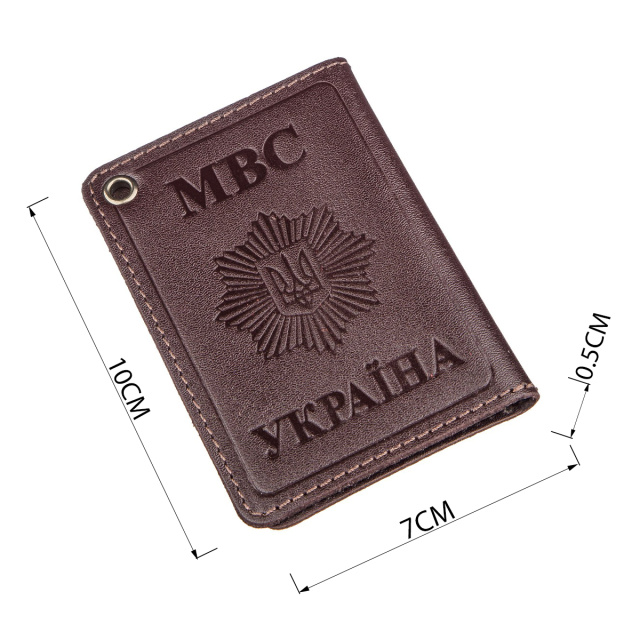 Тонкая обложка на документы МВД Украины поможет сохранить все документы в целости, оберегает от влаги, солнца и износа. Обложка подойдет для новой полиции. Выполнена модель из натуральной кожи. Закрывается в виде книжки. Небольшое прозрачное окошко и надпись «Министерство внутренних дел» на лицевой стороне. На задней части тризубец на звезде и надпись «МВС Украина». Сверху люверс, с помощью которого вы сможете подцепить обложку на карабин. В обложке 2 кармашка. Один из которых под прозрачной пленкой.