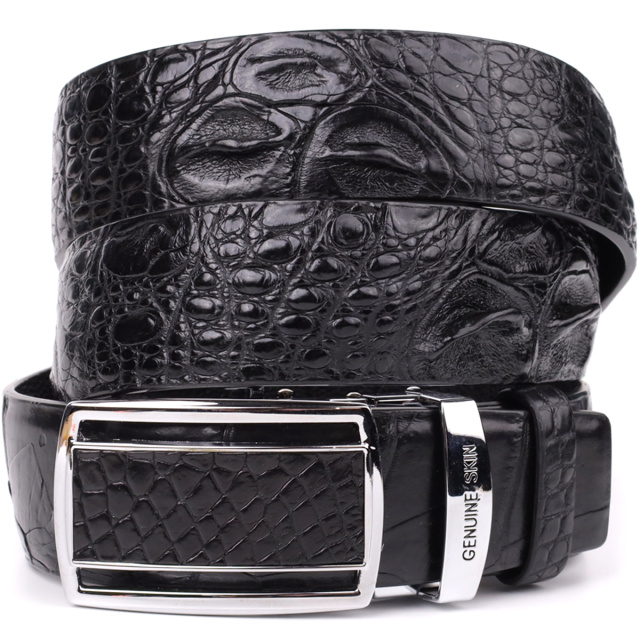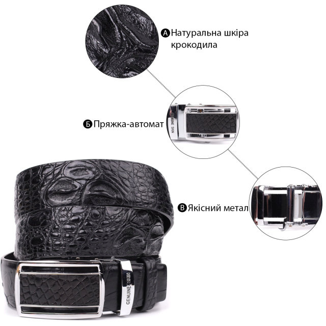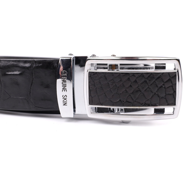Престижный ремень из экзотической, натуральной кожи крокодила. Аксессуар изготовлен на основании из гладкой телячьей кожи и оборудовано съемной автоматической пряжкой, которая декорированная вставкой, из натуральной кожи крокодила. Изделия из кожи крокодила всегда считались большой роскошью, так как в мире не так уж много компаний, которые занимаются выделкой такой кожи, поскольку этот процесс действительно чрезвычайно трудоемкий. Идеальный подарок для людей, которые любят все дорогое и качественное. Ремень универсальный, его можно носить как под джинсы, так и под брюки. Каждое полотно имеет уникальный, не повторяющийся узор, поэтому, покупая ремень из кожи крокодила, вы можете быть полностью уверенны в том, что второго такого ремня нет в природе.